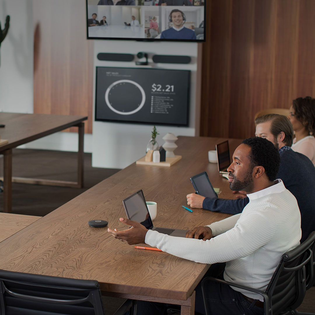 SIN RIESGOS Con la videoconferencia puede quedarse en espacios seguros y controlados. Las reuniones siempre serán posibles a través de una conexión a internet. |